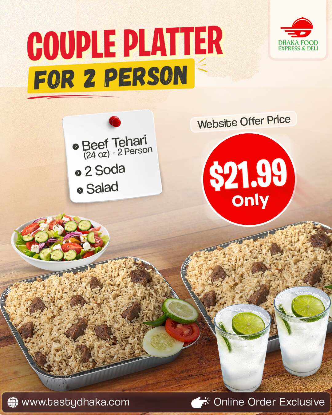 Dhaka Food Express & Deli’s 𝐁𝐞𝐞𝐟 𝐓𝐞𝐡𝐚𝐫𝐢 𝐂𝐨𝐮𝐩𝐥𝐞 𝐏𝐥𝐚𝐭𝐭𝐞𝐫 will let you savor the rich flavor of authentic Tehari. Perfectly portioned for𝐭𝐰𝐨 𝐩𝐞𝐫𝐬𝐨𝐧𝐬, this tasty 24-oz Dhaka-style beef tehari is delivered with a fresh salad and two cool drinks for a full dinner.